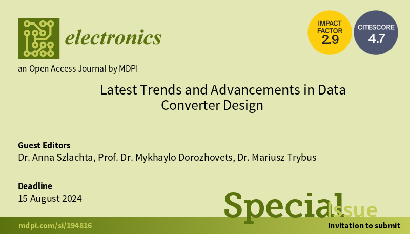 Dr inż. Anna Szlachta, prof. PRz, prof. dr hab. inż. Mykhaylo Dorozhovets oraz dr inż. Mariusz Trybus, prof. PRz zostali redaktorami gościnnymi specjalnego wydania Electronics pt. 'Latest Trends and Advancements in Data Converter Design'. Termin składania rękopisów upływa 15 sierpnia 2024 r. Celem tego specjalnego wydania jest opracowanie praktycznych i teoretycznych artykułów naukowych dotyczących trendów i rozwoju w projektowaniu przetworników danych. Głównym celem jest zaprezentowanie różnorodnych zastosowań oferowanych przez przetworników danych.