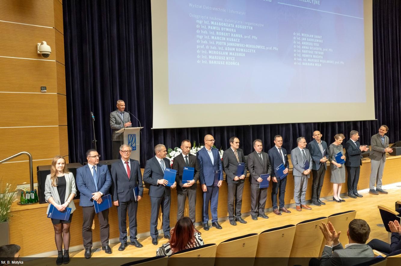 9 listopada 2023r odbyło się uroczyste wręczenie dyplomów nagród Rektora PRz pracownikom, którzy w 2022 roku odznaczyli się osiągnięciami naukowymi, dydaktycznymi i organizacyjnymi. Wśród wyróżnionych znaleźli się pracownicy Katedry Metrologii i Systemów Diagnostycznych: mgr inż. Małgorzata Augustyn, dr hab. inż. Robert Hanus prof. PRz, prof. dr hab. inż. Adam Kowalczyk, dr inż. Anna Szlachta prof. PRz i dr inż. Barbara Wilk.