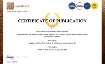 Mgr inż. Magdalena Nizioł współautorką artykułu "The Influence of the Washing Process on the Impedance of Textronic Radio Frequency Identification Transponder Antennas"