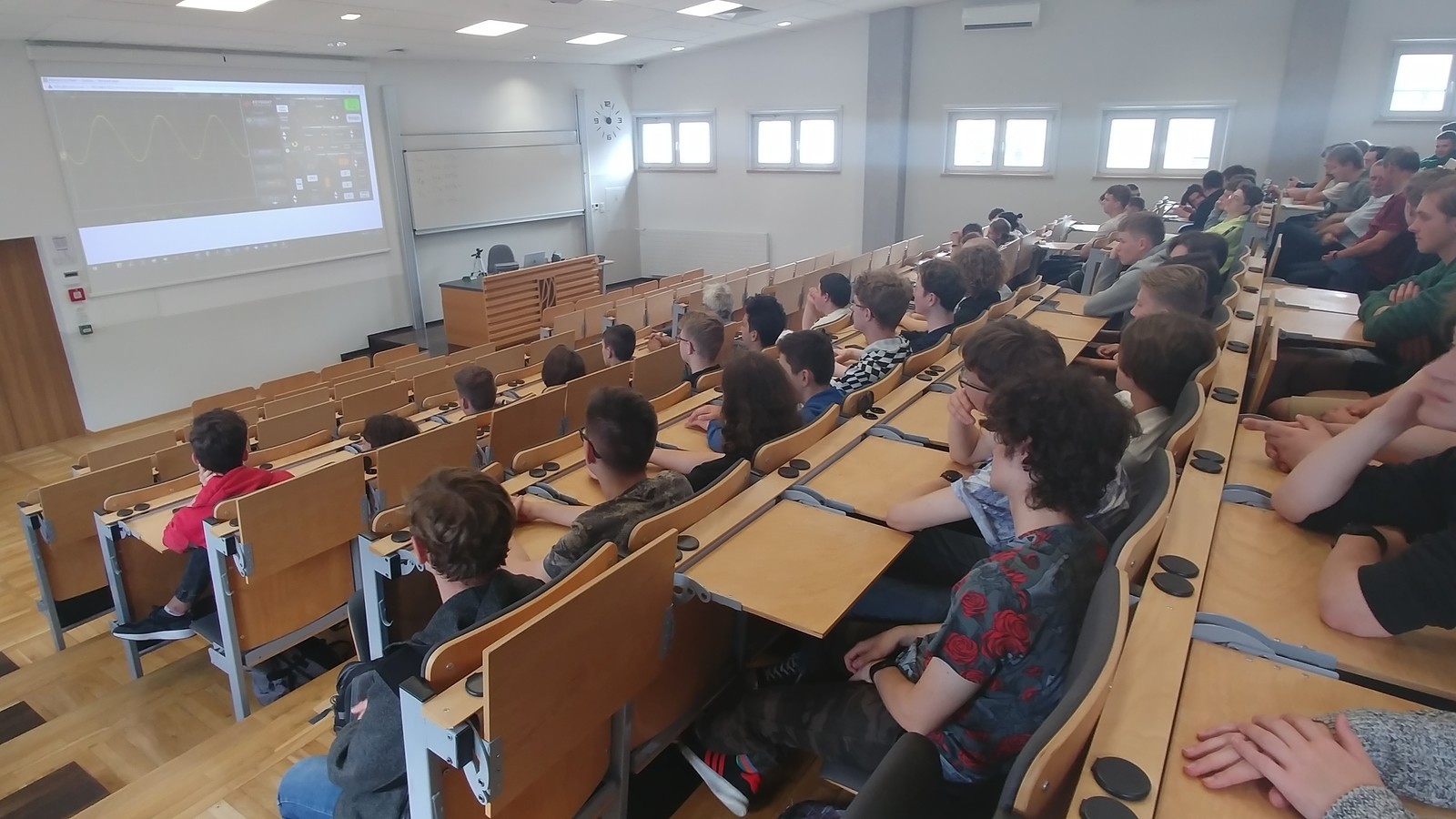 W dniu 2 czerwca 2022 r., w ramach podpisanego porozumienia o współpracy pomiędzy Politechniką Rzeszowską a Zespołem Szkół Elektronicznych w Rzeszowie, odbył się wykład pt. „Pomiary parametrów sygnałów na oscyloskopie cyfrowym”. W wykładzie wzięli udział uczniowie klas drugich o specjalności technik elektronik oraz technik automatyk a także nauczyciele ZSE. Tematyka wykładu dotyczyła m.in. przygotowania do pracy oscyloskopu cyfrowego oraz realizacji pomiarów przy użyciu siatki na ekranie, kursorów oraz z wykorzystaniem pomiarów automatycznych. Omówiono wady i zalety każdego rodzaju pomiaru oraz przedstawiono możliwości zwiększenia ich dokładności. Po wykładzie uczniowie mieli możliwość zapoznania się z budową i zasadą działania oscyloskopu oraz wykonania podstawowych pomiarów.