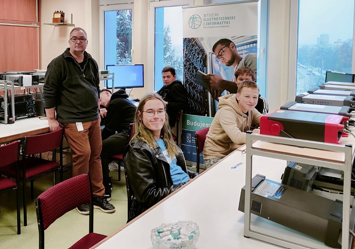 W dniach 18 i 25 listopada 2022 odbyły się pierwsze na Wydziale Elektrotechniki i Informatyki zajęcia w ramach zadania „Politechniczna Sieć VIA CARPATIA im. Prezydenta RP Lecha Kaczyńskiego” (Działanie 1 „Z technikum na politechniki”). W zajęciach uczestniczyli uczniowie klas czwartych Zespołu Szkół Elektronicznych kształcący się w zawodzie „Technik elektronik”. Uczniowie zapoznali się między innymi z budową, działaniem i programową obsługą współczesnych przyrządów pomiarowych i zrealizowali kilka zadań praktycznych m. in. wyznaczyli parametry przebiegu zmiennego, zarejestrowali i zwizualizowali dane pomiarowe oraz wykonali ich analizę statystyczną.